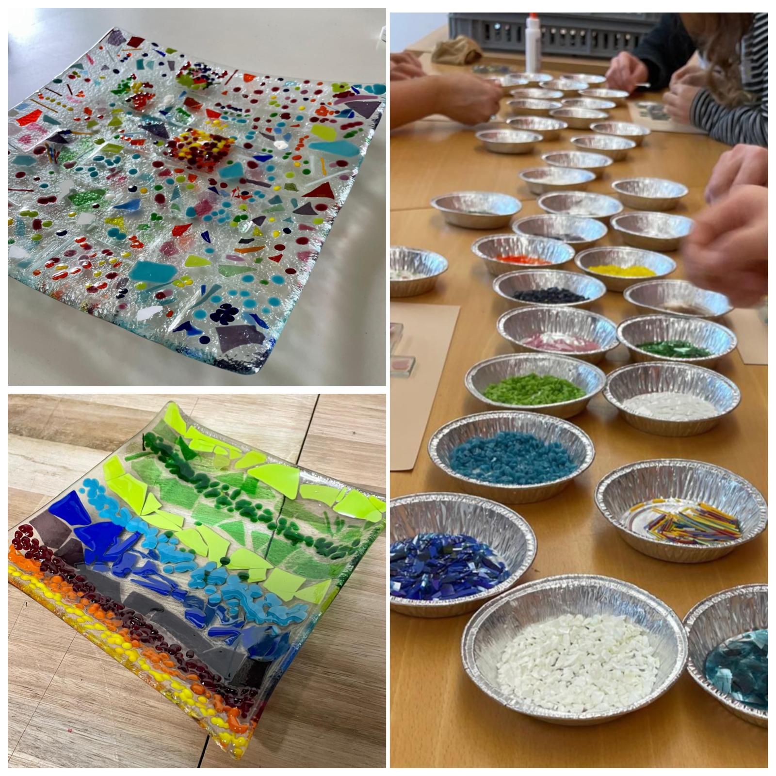 Nach einer kurzen Einführung kannst du bereits dein erstes eigenes Glasobjekt gestalten. Aus einem grossen Sortiment an vorgeschnittenen Glasstücken wählst du aus, was dir gefällt, und belegst z. B. deinen Glasteller damit. Dein Kunstwerk muss im Ofen gebrannt werden und kann erst ca 1 Woche nach dem Ferienplausch abgeholt werden.